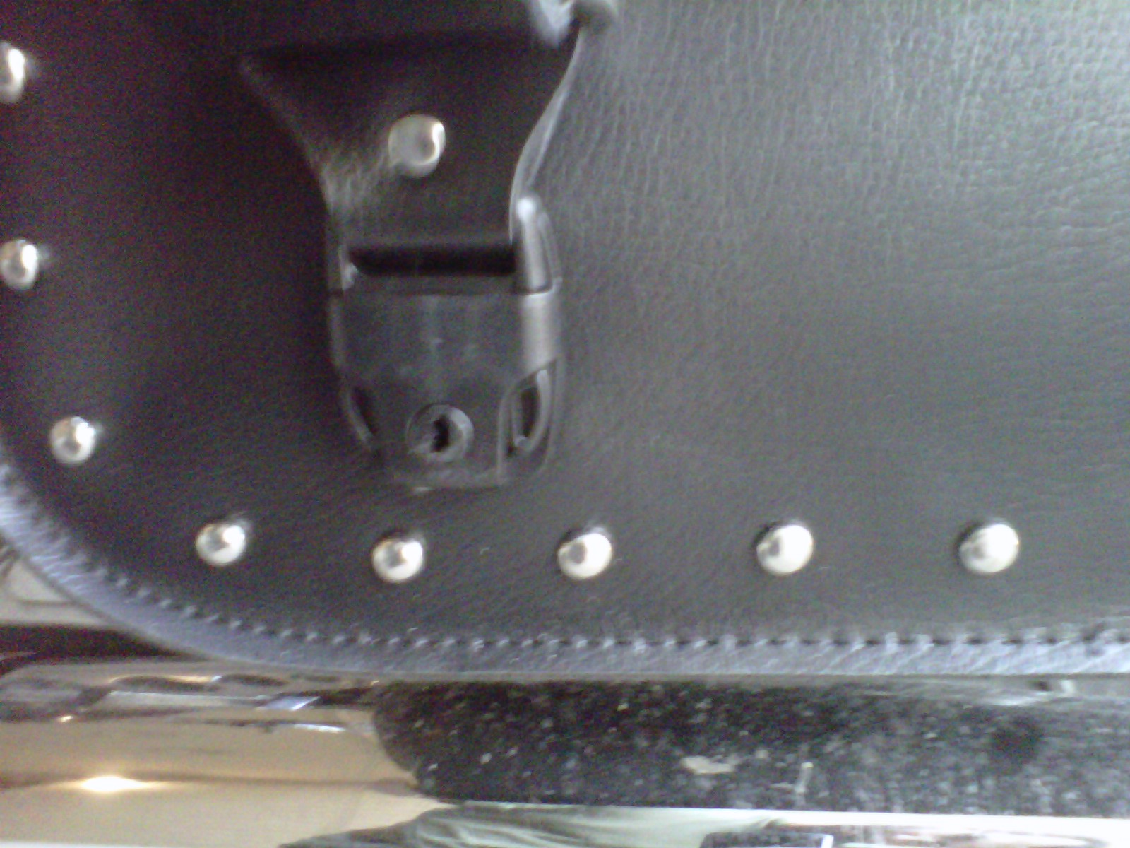 You can see one cut just above middle on the left, and one below middle. I just fitted the bags up the way I wanted them, then poked a knife through the two mounting points that were covered. Piece of cake. Later I will remove the strap and add some stitching to the edge of the cuts to prevent them from enlarging. The strap is pretty wide, and almost encroaches upon the third mounting point that is seen in the middle to the right. I almost want to trim back some of the leather there for a better fit with the bottom of the seat. We will see about that... Once I cut the holes in the leather, I just slapped the rear seat back on, and presto!, I have saddlebags.I have several concerns that I will need to look at after I ride to work tomorrow. One is whether the exhaust is close enough to damage the "genuine immitation leather"(thank you walter matthau). The second, is how much wear will be created by the bag touching the rear shocks: